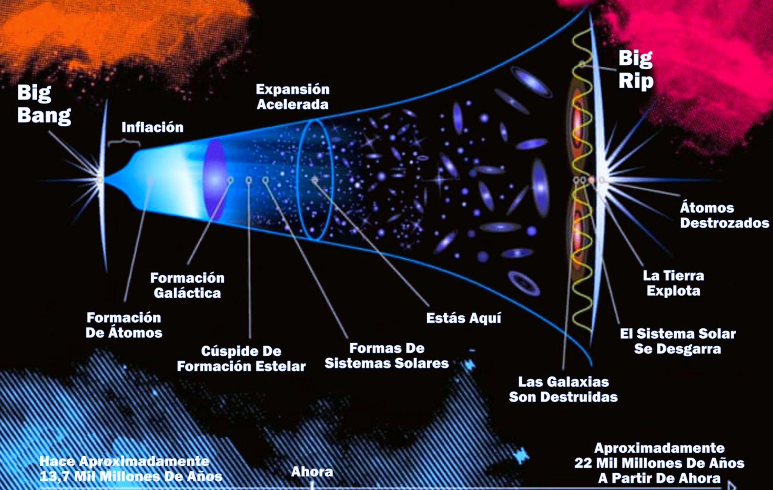 Un empuje cada vez más potente de la gravedad repulsiva acabaría triunfando sobre todas las otras fuerzas atractivas, y todo se desgarraría. Nuestro cuerpo se mantiene como un todo gracias a la fuerza electromagnética, que une nuestros constituyentes atómicos y moleculares, pero gracias también a la fuerza nuclear fuerte, que mantiene unidos losprotones y neutrones dentro de los núcleos atómicos de nuestro cuerpo. Como estas fuerzas son mucho más potentes que el actual empuje hacia fuera del espacio en expansión, el cuerpo se mantiene íntegro. Pero si la fuerza del empuje repulsivo creciera, el espacio del interior del cuerpo acabaría expandiéndose con tal empuje que ganaría a las fuerzas electromagnética y nuclear fuerte que lo mantienen unido. Así que nos inflaríamos y acabaríamos estallando en pedazos, al igual que todo lo demás.