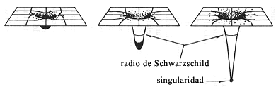 Si construimos las superficies de simultaneidad asociadas al tiempo del observador que penetra al aguejero negro, tendremos una sucesión como la mostrada en la figura 4. En este caso, aparece el interior del aguejero negro y, finalmente, surge la singularidad cuando la esfera masiva se concentra toda en un punto. En algún momento, el observador que penetró al aguejero negro choca con la singularidad y termina definitivamente su viaje.