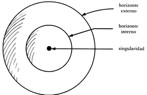 Si el parámetro de momento angular a es igual al valor crítico GM/c, los dos horizontes se fusionan en uno solo. Si a es mayor que GM/c, no hay horizontes: la singularidad queda desnuda y se puede observar desde una distancia prudente. Sin embargo, como veremos más adelante, es imposible destruir el horizonte de un agujero negro arrojándole partículas para hacerlo girar más rápidamente y aumentar de este modo, su momento angular.