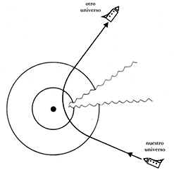 Toda la materia que se encuentra en un agujero blanco tuvo necesariamente que surgir de la singularidad ahí presente. ¿Cuál es el destino de esa materia al cruzar el horizonte y salir a nuestro universo? Para simplificar la discusión, imaginemos un observador (obviamente no terrestre) que haya nacido dentro del agujero blanco. Antes de llegar al horizonte no puede ver ninguno de los universos paralelos en el exterior; la luz que recibe se originó también en la singularidad, por lo que sólo puede observar esa singularidad. En algún momento, nuestro hipotético observador llega al horizonte y se adentra en nuestro propio universo (o al paralelo); a partir de ese instante puede ver lo que sucede fuera de su agujero blanco ... pero en una forma muy especial. Recordemos que si un observador cae a un agujero negro, el tiempo que tarda en llegar al horizonte es finito para él, pero ese mismo tiempo es infinito para un observador lejano que lo ve penetrar al hoyo. En el caso de un agujero blanco, se tiene una situación contraria: lo que es un intervalo de tiempo finito para el observador que emerge del agujero blanco es un intervalo infinito para un observador lejano. En este caso, es el que sale del agujero quien ve a lo lejos lo que ocurrió en el pasado. Al asomarse del horizonte, nuestro hipotético observador presencia, en lo que es un instante para él, el pasado infinitamente remoto de nuestro propio universo.