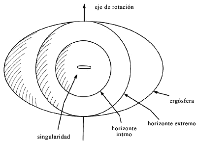Con esta aclaración, regresemos a los agujeros negros con momento angular. Tanto la solución de Schwarzschild como la de Reissner-Nordstrom describen un espacio-tiempo con una perfecta simetría esférica. Éste, evidentemente, no puede ser el espacio-tiempo de un agujero negro rotante, ya que la rotación define una dirección particular —el eje de rotación— que rompe la simetría esférica.