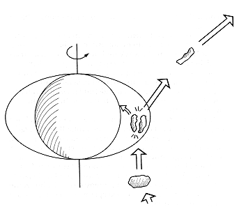 Dado que la ergósfera se encuentra fuera del horizonte externo, es posible que una partícula al penetrar esa región pueda salir de ella y se aleje del agujero. Esta posibilidad sugirió a Roger Penrose un curioso mecanismo para extraer energía de un agujero negro rotante. Supongamos que una partícula masiva es arrojada al agujero negro y que, estando en la ergósfera, se rompe en dos pedazos, de tal forma que un pedazo penetra al agujero y el otro se escapa (Figura 13). Penrose demostró que, para algunas trayectorias, es posible que el pedazo que se escapa salga con más energía de la que poseía la partícula entera antes de entrar. Así, en principio, sería posible utilizar un agujero negro rotante como fuente de energía; se mandan partículas a la ergósfera con una trayectoria bien calculada y se recogen los pedazos de esas partículas, arrojados con una energía mayor que la original.