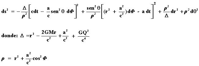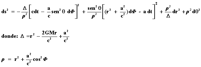 La solución de Kerr describe el espacio-tiempo de un agujero negro rotante. Como tal, posee dos parámetros: la masa M y el momento angular S del hoyo. En el caso particular en que S es cero, la solución de Kerr se reduce exactamente a la de Schwarzschild. En la figura 11 se muestra la forma explícita de la solución; el lector notará que es considerablemente más complicada que la de Schwarzschild.