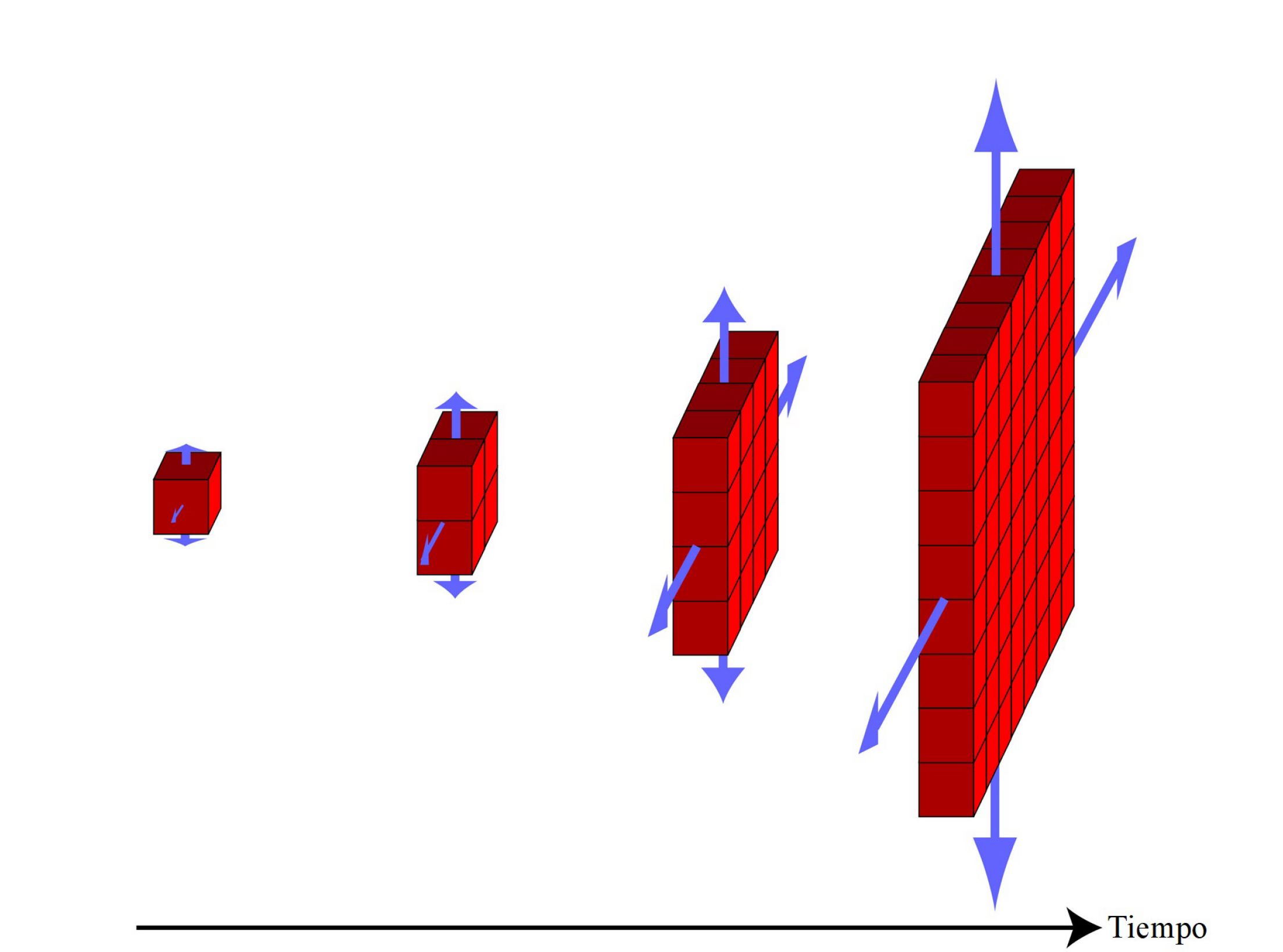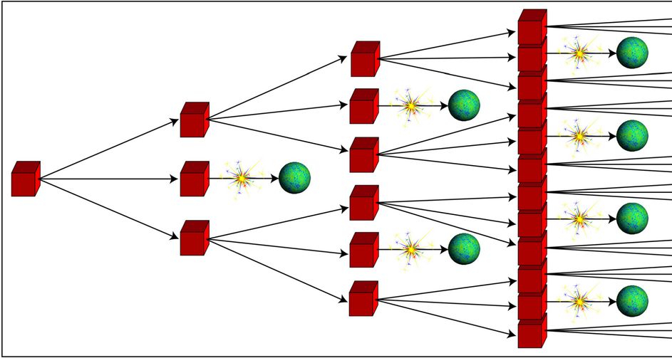Hasta el momento actual, investigadores de todo el orbe han analizado en detalle un conjunto enorme de modelos de inflación, y se ha descubierto que casi todos ellos conducen a la inflación eterna. Aunque la mayoría de esos cálculos son bastante complejos, la ilustración esquemática de la figura capta la esencia de por qué la inflación es eterna en general: para que funcione la inflación en primer lugar, la sustancia inflacionaria debe expandirse más rápidamente de lo que decae, y esto provoca de manera automática que la cantidad total de materia inflacionaria crezca sin límites.