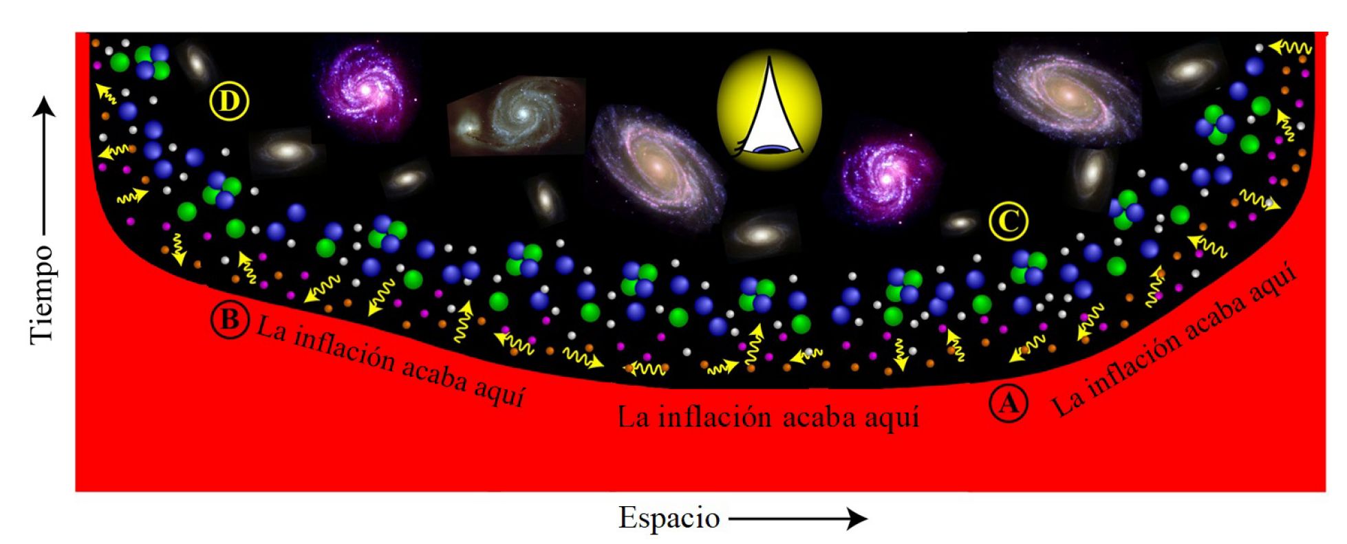 La inflación puede crear un Universo infinito dentro de lo que desde fuera parece un volumen subatómico. Un observador situado en su interior vería el suceso A simultáneo a B, el suceso C simultáneo a D, vería la superficie infinita en forma de U donde acaba la inflación como su tiempo cero, la superficie infinita en forma de U donde se forman átomos como su tiempo cuatrocientos mil años, etc. Para simplificar, esta representación no incluye ni la expansión del espacio, ni dos de las tres dimensiones espaciales.
