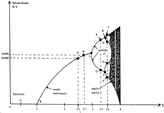 Los valores de q para los cuales no se obtienen valores finales, se marcarán en la gráfica con una línea completa, ya que todos los valores son posibles. De la gráfica se puede observar lo siguiente, a medida que va aumentando el valor de q: Para q menor o igual que 1, los valores son nulos; hay extinción de la población. Para q entre 1 y 3 , solamente hay un solo valor final, el del estado estacionario, que va aumentando a medida que q aumenta. En este intervalo la gráfica es la línea curva KL.