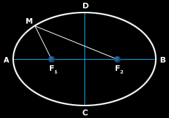 Una elipse es básicamente un círculo ligeramente aplastado. Técnicamente se denomina elipse a una curva plana y cerrada en donde la suma de la distancia a los focos (puntos fijos, F1 y F2) desde uno cualquiera de los puntos M que la forman es constante e igual a la longitud del eje mayor de la elipse (segmento AB). El eje menor de la elipse es el segmento CD, es perpendicular al segmento AB y corta a este por el medio.