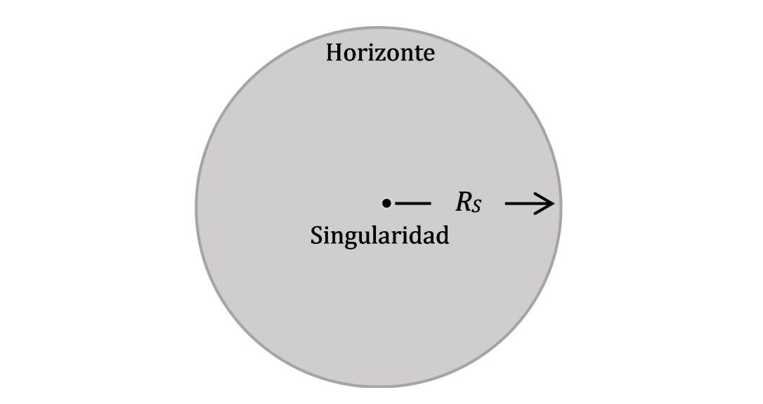 donde G es la constante de gravitación y c es la velocidad de la luz en el vacío. Pero según la relatividad general, el objeto no puede mantenerse estático en su radio de Schwarzschild, pues la gravedad que ejerce sobre sí mismo es tan poderosa, que sobreviene un colapso que ninguna fuerza conocida puede detener. El colapso gravitacional termina cuando toda la masa queda reducida a un punto matemático de densidad infinita conocido como singularidad, localizado en el centro de la esfera de radio RS; por definición, en ese momento se ha formado un agujero negro. La esfera de radio RS se denomina horizonte y define el límite que separa al agujero negro del resto del Universo.