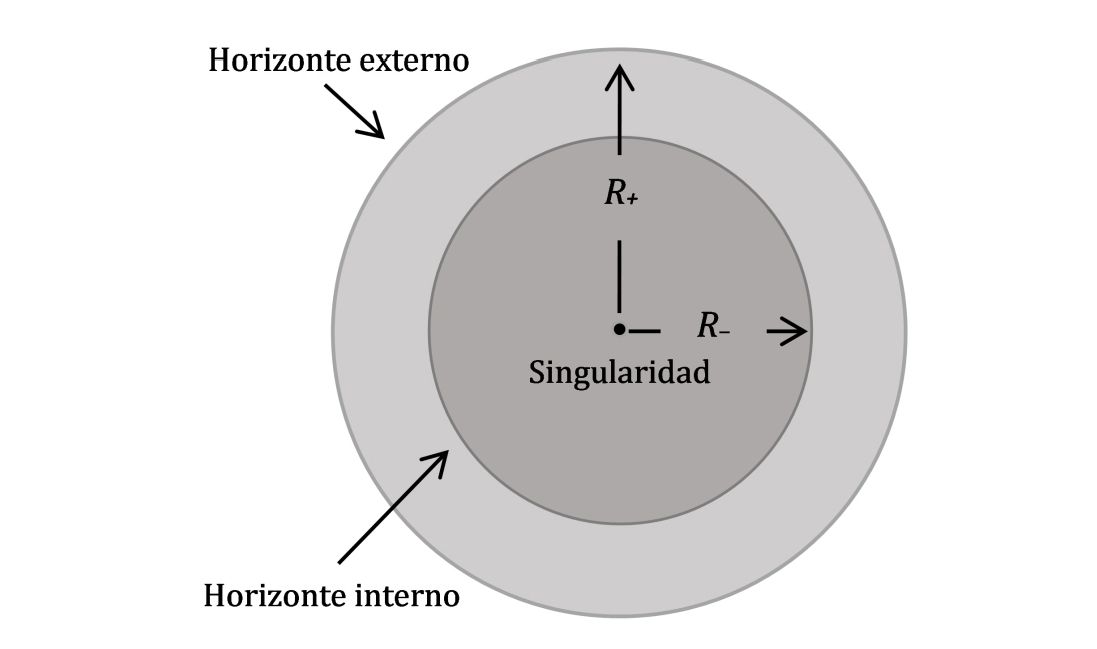 Es importante hacer notar que si bien, de acuerdo con la Fig. 1, RS representa la distancia radial desde la singularidad hasta el horizonte, cerca de un agujero negro y en su interior las distancias radiales son solo paráametros y no tienen el signi cado físico que les atribuimos en nuestra experiencia directa. Por tanto, la Fig. 1 solo tiene un valor pedagógico y no debe considerarse una representación exacta de la realidad. Esto también es válido para las figuras que usaremos en las siguientes secciones para representar la estructura interna de los otros tipos de agujero negro.