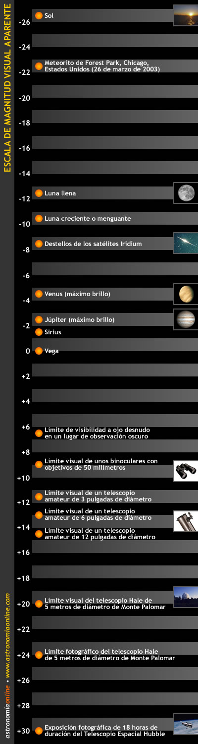 Una de las características curiosas de la escala de magnitudes es que la magnitud aumenta cuando el brillo disminuye y viceversa, la magnitud disminuye cuando el brillo aumenta. Por ejemplo, las estrella de 1ª magnitud, fácilmente visibles a simple vista son 100 veces más brillantes que las de de 6ª magnitud, apenas visibles a simple vista. La consecuencia de todo ello es que los objetos muy brillantes adquieren magnitudes negativas. Por ejemplo, una estrella que sea aproximadamente 2,5 veces más brillante que otra de 1ª magnitud, tendrá una magnitud menos, por lo que al restar 1 a 1, quedará magnitud 0. Si tenemos otra estrella que a su vez sea 2,5 veces más brillante que otra de magnitud 0, como que su brillo en magnitudes es una unidad inferior, resultará un brillo de -1 magnitudes, y así sucesivamente. El astro más brillante del cielo es el Sol con una magnitud de -27, después le sigue la Luna llena con una magnitud de -12, y a continuación Venus con una magnitud máxima de -4,5. Hasta hace unos años, antes de la llegada de las nuevas tecnologías de registro digital de imágenes, las estrellas más débiles que podían fotografiarse eran de magnitud 23, es decir, unos 631 millones de veces más débil que una estrella de 1ª magnitud.