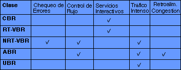 CBR es útil para ofrecer los servicios que típicamente resuelve el sistema telefónico, aunque no hay control de errores, ni congestionamiento ni ningún otro procesamiento extra. RT-VBR garantiza que la aplicación obtendrá el ancho de banda requerido y es útil en servicios de tiempo real como las videoconferencias y el despliegue de presentaciones tipo filme. NRT-VBR es igual que el anterior, excepto que el protocolo puede tener un retraso en la entrega tal como en el servicio de correo electrónico. ABR está enfocado a ofrecer un ancho de banda base y si la aplicación requiere más entonces hará su mejor esfuerzo para incrementarla. UBR no promete ningún ancho de banda base ni control de flujo ni chequeo de errores, lo cual es útil para enviar paquetes IP y no incrementar la sobrecarga en el nivel de transporte. Si la red está congestionada, los paquetes son descartados sin avisar, pero si hay ancho de banda sobrante, se entregan la mayor cantidad de paquetes posibles.