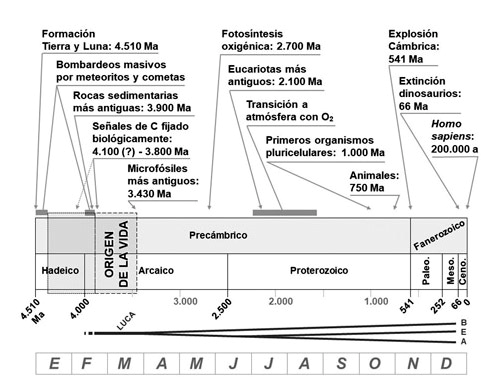 Representación de la historia de la Tierra, dividida en los correspondientes eones y eras, mostrando algunas de las principales etapas en el origen y la evolución de la vida. Bajo la línea de tiempo aparece el árbol que se diversifica hasta formar los tres dominios filogenéticos: Bacteria, Eukarya y Archaea. En la parte inferior se muestra la equivalencia de los 4.510 Ma con un año: las 0:00:00 h del 1 de enero corresponderían al origen del sistema Tierra-Luna, en marzo comenzaría la vida (como la primavera en un año real) y a las 23:59:59 h del 31 de diciembre estaríamos en el momento actual.