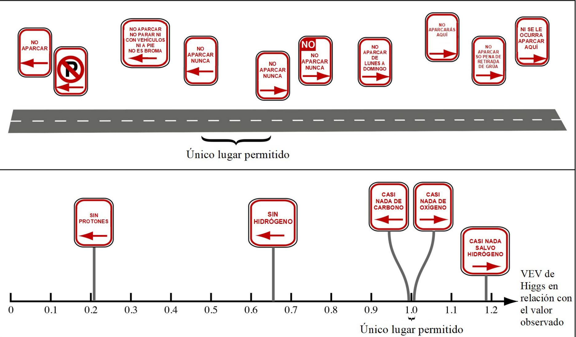 Si una calle tiene muchas señales puestas al azar que prohíben aparcar a su izquierda o a su derecha, entonces es bastante improbable que se pueda aparcar en algún lugar de esa vía: solo se podrá si todas las señales con flechas que prohíben aparcar a su izquierda acaban a la izquierda de todas las señales que prohíben aparcar a su derecha, como en el ejemplo del panel superior de esta imagen. De manera similar, si un Universo posee un parámetro físico que debe satisfacer un montón de restricciones para que se dé la vida (panel inferior), a priori parece improbable que haya algún valor para dicho parámetro que caiga dentro del rango habitable. Situaciones como las ilustradas aquí se pueden interpretar, pues, como indicios, respectivamente, de la existencia de muchas calles o de muchas estructuras matemáticas en un Multiverso del nivel IV.