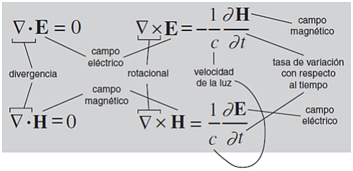 Una vez resuelto qué eran los campos magnéticos y eléctricos, Maxwell podía escribir ecuaciones describiendo qué hacían. Ahora expresamos estas ecuaciones usando dos operadores vectoriales, conocidos como divergencia y rotacional. Maxwell usó fórmulas específicas que envolvían las tres componentes de los campos eléctrico y magnético. En el caso especial en el que no hay alambres conductores ni placas metálicas, ni imanes, y todo sucede en el vacío, la ecuación adopta una forma ligeramente más simple, y restringiré la discusión a este caso. Dos de las ecuaciones nos dicen que los fluidos eléctricos y magnéticos son incomprimibles, esto es, la electricidad y el magnetismo no pueden evaporarse sin más, tienen que ir a algún sitio. Esto se traslada como «la divergencia es cero», lo que nos lleva a las ecuaciones.