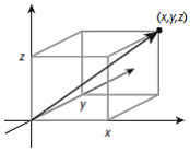 Ahora interpretamos sus ecuaciones usando vectores, que son cantidades que no solo tienen un tamaño, sino que tienen una dirección. El más familiar es la velocidad: el tamaño es la celeridad, cuán rápido se mueve el objeto; la dirección es la dirección a lo largo de la que se mueve. La dirección sí que importa realmente; un cuerpo moviéndose verticalmente hacia arriba a 10 km/s se comporta de un modo muy diferente a uno que se mueve verticalmente hacia abajo a 10 km/s. Matemáticamente, un vector se representa por sus tres componentes: su efecto a lo largo de tres ejes que son perpendiculares entre ellos, como norte/sur, este/oeste y arriba/abajo. De modo que lo mínimo es un vector que sea un conjunto (x, y, z) compuesto de tres números (siguiente figura). Por ejemplo, la velocidad de un fluido en un punto dado es un vector. Por el contrario, la presión en un punto dado es un único número; el término técnico usado para distinguirlo de un vector es «escalar».