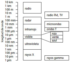 Pero hay más. La luz llega en muchos colores diferentes y, una vez sabes que la luz es una onda, puedes averiguar que esto se corresponde con ondas con diferentes longitudes de onda (la distancia entre picos sucesivos). La ecuación de onda no impone condiciones sobre la longitud de onda, de modo que puede ser cualquiera. Las longitudes de onda de la luz visible están restringidas a un rango pequeño, a causa de la química de los pigmentos detectores de luz de los ojos. Los físicos ya conocían la «luz invisible», ultravioleta e infrarrojos. Estas, por supuesto, tenían longitudes de onda justo fuera del rango visible. Ahora las ecuaciones de Maxwell llevan a una predicción drástica: deberían existir también ondas electromagnéticas con otras longitudes de onda. Posiblemente pueda darse cualquier longitud de onda, larga o corta (siguiente figura).