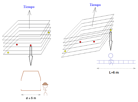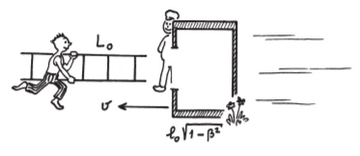 acuerdo en sus mediciones ya que ambos observadores no pueden ver historias diferentes. Si por ejemplo intentamos cerrar ambas puertas justo cuando el extremo posterior de la escalera ha cruzado la puerta delantera, ambas puertas no se cerrarán simultáneamente desde el SR del hijo del granjero: primero bajará la puerta posterior y luego la anterior de forma que la puerta nunca golpeará la escalera y por tanto nunca sucederá que ambos observadores vean fenómenos diferentes (como sería una escalera rota y una escalera entera).