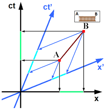 Tanto la escalera como el granero pueden considerarse objetos físicos en un espacio-tiempo cuatridimensional. Diferentes SR miden diferentes valores de espacio y de tiempo de un mismo objeto o evento en cuatro dimensiones. Uno medirá mayor valor de tiempo y menor de espacio y el otro menor valor de tiempo y mayor de espacio. Los objetos con masa no podrán jamás alcanzar la velocidad de la luz y solo los objetos muy ligeros como partículas elementales pueden viajar a velocidades relativistas. Esto implica que los objetos masivos viajan casi exclusivamente en la dimensión temporal y solo los objetos muy ligeros pueden viajar en las dimensiones espaciales.
