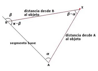 Así, si pretendemos calcular la distancia desde el punto A hasta el objeto X, nos movemos a lo largo de una recta arbitraria hasta otro punto B, definiendo el segmento base AB, con lo cual podremos medir el ángulo a que con dicha recta forma una visual al objeto desde A y el ángulo ß que forma con AB otra visual al objeto desde el otro extremo B.