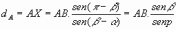 Se tiene entonces que el triángulo ABX puede resolverse elementalmente por conocerse del mismo un lado (distancia AB) y los tres ángulos (a, b, Ya-b).