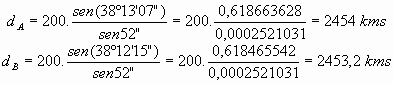 Ejemplo: Calculemos la distancia a la que se encuentra un objeto sabiendo que hemos medido la distancia rectilínea entre dos puntos A y B, resultando AB=200 kms, y los ángulos del mismo lado que forma la dirección del objeto con el segmento base son 38º12’15” desde A, y 38º13’07” desde el punto B
