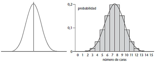 FIGURA. A la izquierda: campana de Gauss. A la derecha: cómo aproximar el número de caras en 15 lanzamientos de una moneda no trucada.