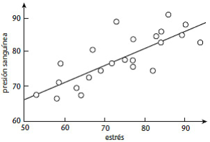 FIGURA. Utilización del método de los mínimos cuadrados para relacionar la presión sanguínea y el estrés. Los puntos: los datos. La línea: la línea recta que se ajusta mejor.