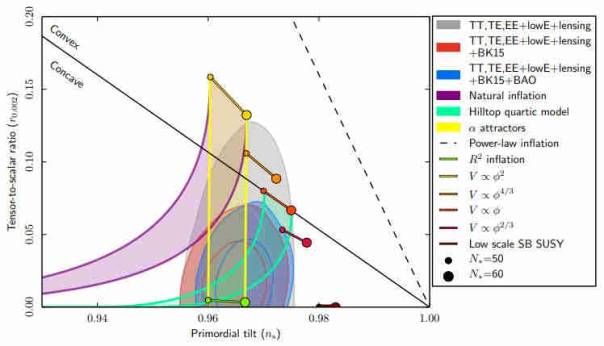 Modelos de inflación favorecidos: potenciales X^P con P<1 (lineas marrón y rosa), inflación R2 o inflación de Starobinsky (linea verde inferior), "alpha atractors" y modelos basados en D-Branas.