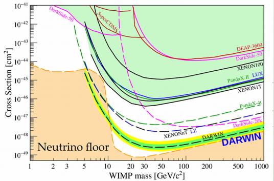 Los nuevos detectores basados en líquidos nobles (principalmente XENONnT,PandaX-4t,LZ y DarkSide-20k y sobre todo DARWIN) llevarán los límites de exclusión para partículas WIMPs hasta casi el límite de lo explorable: el denominado "fondo de neutrinos". Este "fondo" coincide con la sección eficaz de los neutrinos procedentes de los primeros instantes del Universo. Si la materia oscura estuviese en esta región sería muy difícil distinguirla; por esto, algunos físicos piensan que el experimento DARWIN significaría la última oportunidad para encontrar WIMPS.