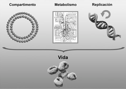 Los tres sistemas fundamentales de los seres vivos: compartimento, metabolismo y replicación.