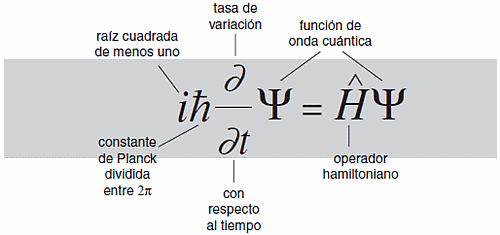 Aquí Ψ (la letra mayúscula griega psi) es la forma de la onda, t es el tiempo (de modo que ∂/∂t aplicado a Ψ da su tasa de variación con respecto al tiempo), Ĥ es una expresión llamada el operador Hamiltoniano, y ħ es h/2π, donde h es la constante de Planck. ¿E i? Esa era la característica más rara de todas. Es la raíz cuadrada de menos uno. La ecuación de Schrödinger se aplica a ondas definidas en los números complejos, no solo los números reales como ocurre en la ecuación de onda común. ¿Ondas en qué? La ecuación de onda clásica define ondas en el espacio, y su solución es una función numérica del espacio y el tiempo. Lo mismo aplica para la ecuación de Schrödinger, pero ahora la función de onda Ψ toma valores complejos, no solo reales. Es un poco como una ola del mar cuya altura es 2 + 3i. La aparición de i es de muchas maneras la característica más misteriosa y profunda de la mecánica cuántica. Previamente i había aparecido en las soluciones de ecuaciones, y en métodos para encontrar esas soluciones, pero aquí era parte de la ecuación, una característica explícita de la ley física.