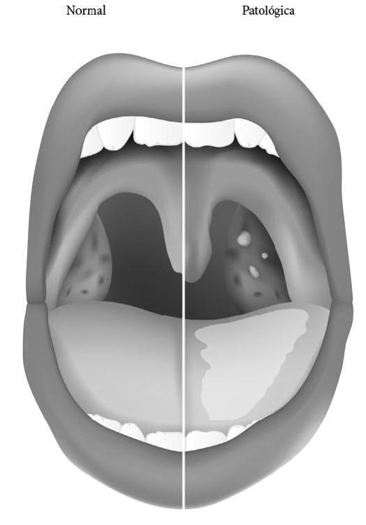 Aspecto esquemático de una boca normal (a la izquierda) y otra con la clásica amigdalitis por patógenos bacterianos, mostrando cambios en el aspecto de la lengua, inflamación en el itsmo de las fauces y pequeñas «placas» en la amígdala palatina derecha