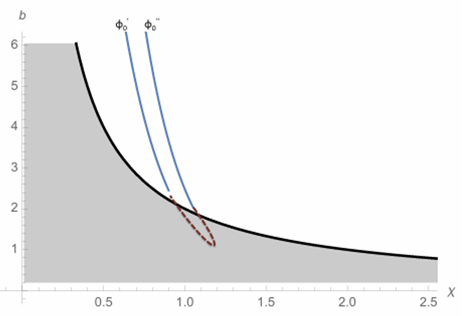La gráfica nos muestra que para los valores de b y x en el intervalo punteado las trayectorias psio´ y psio´´dejan de ser clásicas y el espacio-tiempo se comporta de forma puramente cuántica. La zona sombreada es una región donde el espacio-tiempo clásico que conocemos no existe. Esta zona puede considerarse una región más allá del espacio-tiempo clásico y podría poseer propiedades similares a la región Euclídea del instantón asociado a la función de onda de no contorno donde se producen "saltos" cuánticos por efecto túnel entre trayectorias clásicas. De esta forma, en la zona sombreada podría producirse un "salto" entre las trayectorias psio´ y psio´´.