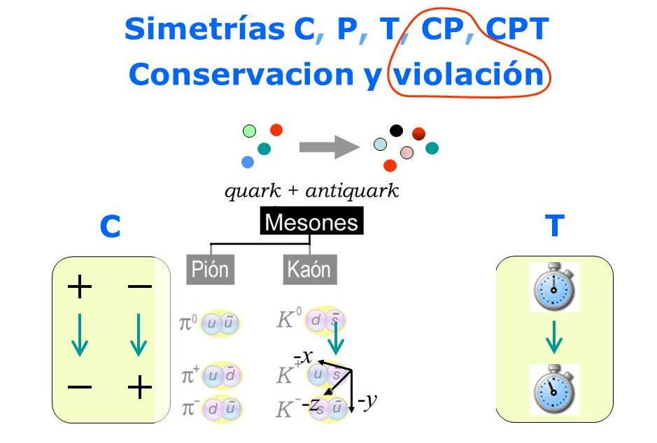 ¿No existe entonces una simetría fundamental en el Universo? La respuesta es sí, pero no es la simetría CP que se había supuesto. Había que combinar las dos operaciones anteriores con una tercera, la inversión temporal, que se expresa como T, y que no es más que la reflexión de la coordenada temporal que mencionaba antes al discutir la teoría de la relatividad. Está operación implica invertir la dirección del tiempo. La mayor parte de las leyes Físicas son invariantes bajo esta inversión temporal.