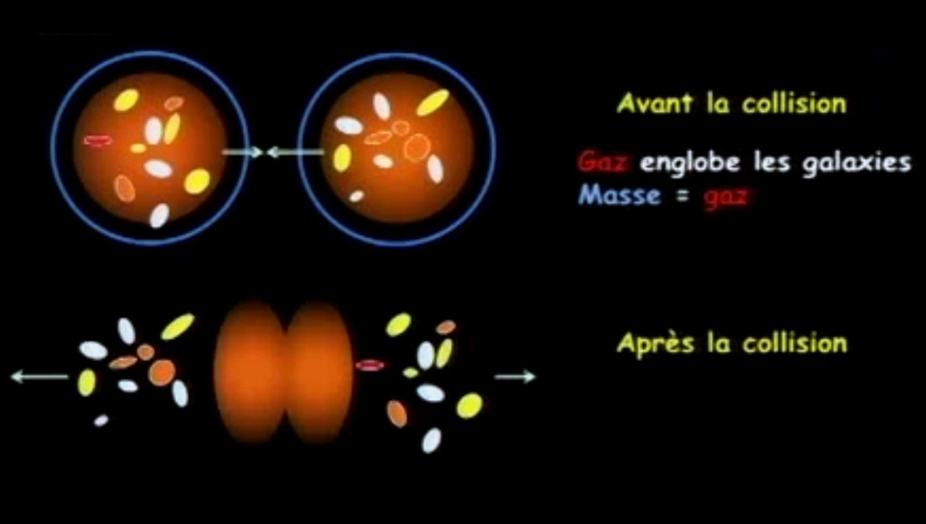 El efecto que hemos descrito anteriormente es tan importante que, cuando se hicieron las primeras simulaciones de cúmulos de galaxias, en la que se dividió la masa observada típica de cúmulos entre las galaxias que lo componen, no sólo se desarrolló un grado altísimo de segregación de masa, debido a que las galaxias más pesadas se hundían rápidamente hacia el centro del cúmulo, sino que todas las galaxias se desaceleraban rápidamente cayendo hacia el centro del cúmulo, provocando su rápido colapso. Fue esto último lo que invitó a los investigadores a asumir que la mayor parte de la masa de los cúmulos estaba asociada a un medio intergaláctico, y no a las galaxias. Así se logró disminuir la masa de las galaxias, reduciendo consecuentemente la magnitud de la aceleración de Chandrasekhar. Eso fue hecho en forma, digamos, casi sutil, no tanto como para proteger a la teoría newtoniana, sino que más bien para dar explicaciones a las observaciones. Sin embargo, trajo importantes implicaciones; la más directa de ellas fue eliminar efectivamente el proceso de fricción dinámica como un factor importante en la evolución de los cúmulos de galaxias. Es muy probable que el resultado de esto sea nuestra incapacidad de explicar, entre otras cosas, la formación de las galaxias elípticas, y en especial ese tipo de galaxias gigantes llamadas cD que habitan los centros de los cúmulos.