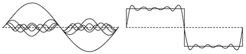 FIGURA. Cómo obtener una onda cuadrada a partir de senos y cosenos. A la izquierda: las ondas sinusoidales que lo componen. A la derecha: su suma y una onda cuadrada. Aquí mostramos unos pocos de los primeros términos de la serie de Fourier. Términos adicionales hacen la aproximación a la onda cuadrada incluso mejor.