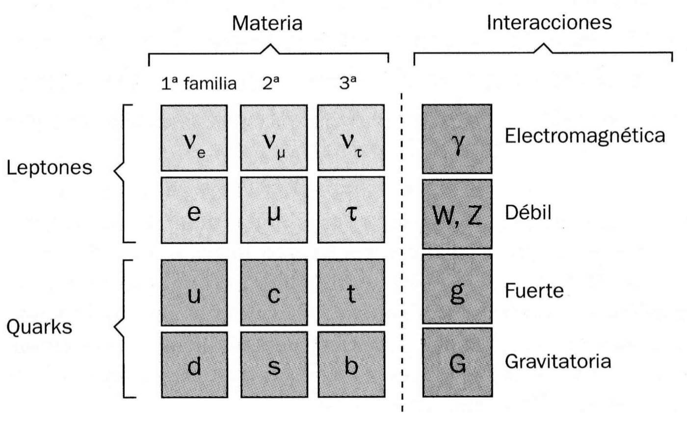Existen otras dos familias de partículas elementales, totalmente análogas a la primera: la familia del muón (µ) y la del tau (τ). El muón y el tau son prácticamente idénticos al electrón en todas sus propiedades, excepto en su masa: el muón es unas 200 veces más pesado que el electrón, y el tau unas 3500. Cada uno tiene su familia completa, formada por un neutrino (νµ y ντ, respectivamente) y una pareja de quarks (c, s para el muón, y t, b para el tau). Las letras que designan los quarks son las iniciales de los nombres que los físicos les dieron históricamente: up, down, charm, strange, top y bottom. Cada familia es una réplica casi exacta de la anterior, excepto que las masas de sus partículas son mayores. Podemos resumir esta información en la siguiente tabla, donde a la derecha de cada partícula aparece su masa expresada en GeV: