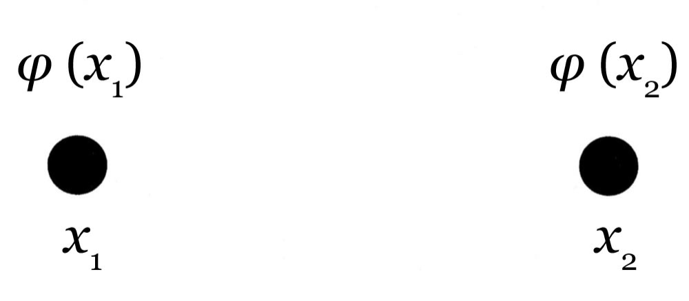 El hecho de que las simetrías locales conduzcan a la existencia de interacciones es tan importante que merece la pena entenderlo con más profundidad. Para ello, vamos a imaginar un modelo simplificado de universo, en el que este solo tiene dos puntos: x1 y x2; tal como muestra la figura. Por supuesto, este modelo de universo es completamente irreal, pues el auténtico tiene infinitos puntos, pero nos sirve para ilustrar la idea.