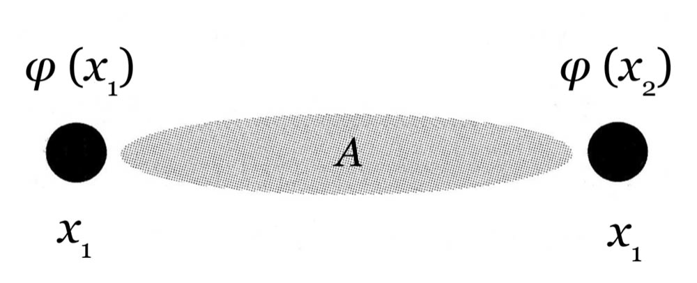 Por tanto, la ecuación no es invariante bajo la transformación local. No obstante, imaginemos que la naturaleza de este universo diminuto «ha decidido» que la transformación local es una auténtica simetría. Esto significa que hemos de cambiar la ecuación de alguna manera para que sea invariante. Y el truco para conseguirlo es añadir un campo nuevo a este universo, al que llamaremos campo A. Este campo se sitúa imaginariamente entre los puntos x1y x2, como ilustra esta figura: