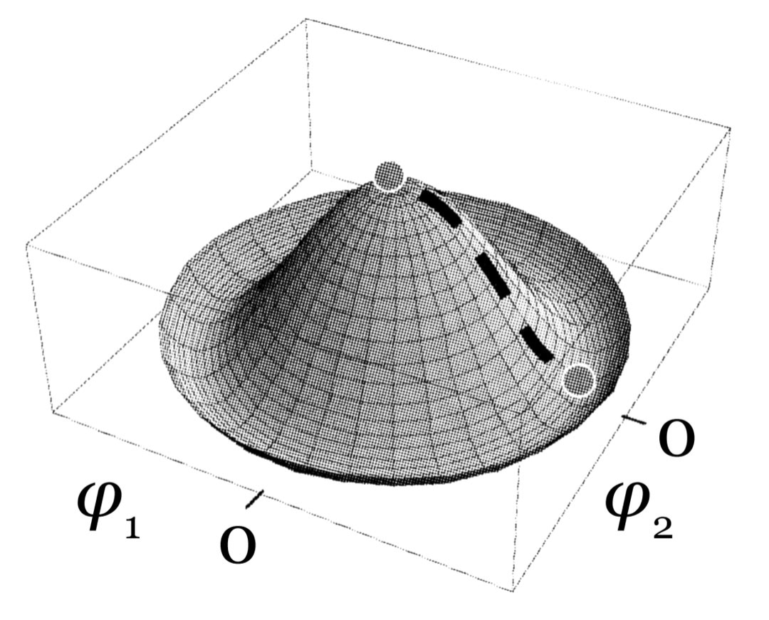 La altura de la superficie dibujada representa la energía almacenada para cada valor posible de φ1 y φ2. Esto es lo que se llama el potencial asociado a los campos φ1 y φ2. En nuestro ejemplo, el potencial es máximo cuando los dos campos toman el valor cero (la cúspide de la cúpula). Al alejarnos de ese valor, el potencial disminuye, aunque luego vuelve a aumentar. Naturalmente, el potencial asociado a los dos campo φ1 y φ2 no tiene por qué tener el aspecto que hemos dibujado. Por ejemplo, el punto central, φ1= 0, φ2 = 0, podría haber correspondido a un mínimo del potencial, en vez de a un máximo. No entraremos ahora en las razones físicas que pueden causar que el potencial sea como el de la figura. Pero está claro que, si esto es así por el motivo que sea, de forma natural los campos φ1 y φ2 se alejarán del punto cero hasta terminar con un valor que minimice el potencial, es decir, algún punto del canal circular que rodea la cúspide del potencial. Esto está representado en la figura por una bola que se desliza por la ladera del potencial hasta dicho canal. La posición de la bola simboliza el valor de los campos φ1 y φ2 en un momento dado. Pensemos en lo que significa este proceso físicamente.