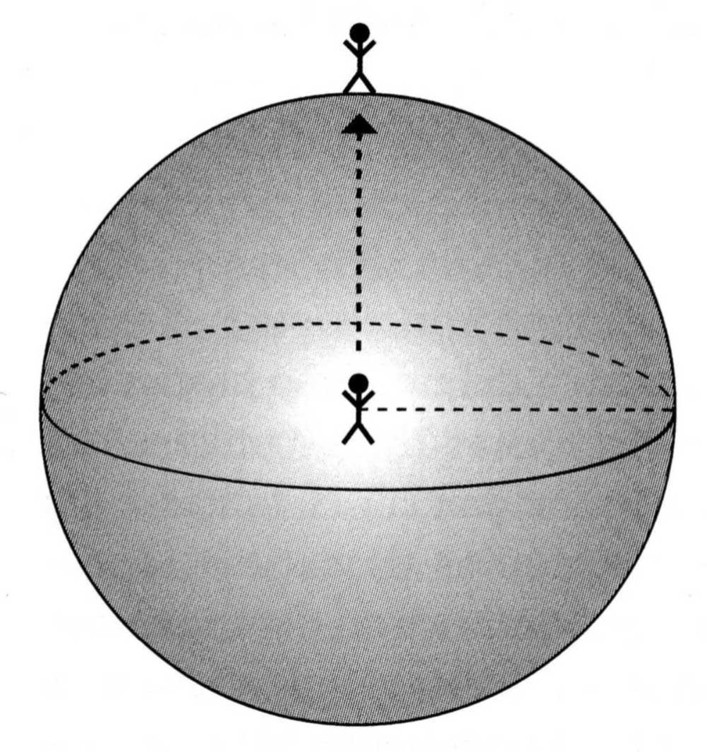 Ahora bien, ¿cuáles son exactamente las simetrías del ME que se rompen? Como puede imaginarse de todo lo anterior, son las que están detrás de las interacciones cuyas partículas mediadoras tienen masa, o sea, los bosones W y Z que transmiten la interacción débil. Esto fue formulado con todo detalle en los años sesenta por Sheldon Glashow, Steven Weinberg y Abbdus Salam. La idea es que las interacciones débiles y electromagnéticas provienen todas ellas de una gran simetría, la llamada simetría electrodébil. Esa simetría es la que se rompe espontáneamente (se camufla) debido a que el campo de Higgs toma un valor en el vacío. Por el contrario, la simetría de color, asociada a las interacciones fuertes, queda intacta, y por tanto los gluones permanecen sin masa. Pero no toda la simetría electrodébil se rompe. Hay una parte de ella que sobrevive sin romperse. ¿Qué queremos decir con esto? Para entenderlo, imaginemos a una persona en el centro de una gran esfera, tal como representa la figura.