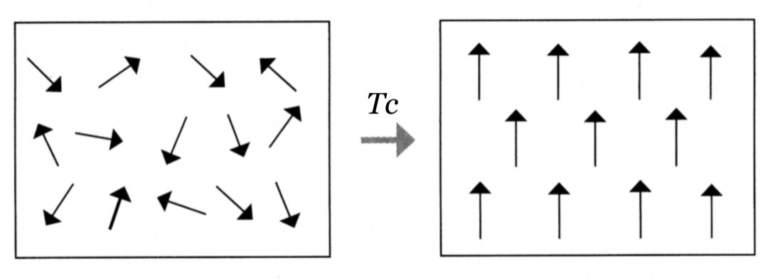 Sin embargo, si la temperatura es muy alta, la agitación térmica de los electrones hace que sus espines (y por tanto sus momentos magnéticos) apunten al azar. En ese caso, los campos de estos pequeños imanes apuntan cada uno en una dirección y en promedio se contrarrestan, por lo que el material no presenta magnetismo. Pero si la temperatura desciende, hay una temperatura crítica (o temperatura de Curie), por debajo de la cual vuelve a ser ventajoso energéticamente que los espines se alineen de forma espontánea, a pesar de la agitación térmica. Por ello, el material vuelve a estar espontáneamente magnetizado. Este fenómeno lo podemos representar gráficamente de esta forma: